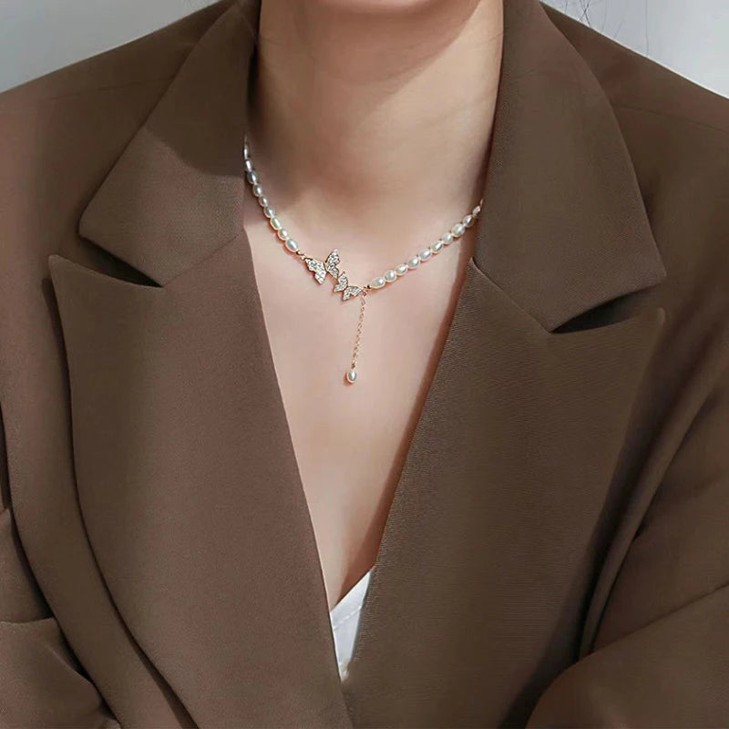 Graceful and sparkling, the Double Rhinestone Butterfly Necklace brings a delicate yet dazzling touch to your jewelry collection. Featuring two layered butterflies adorned with shimmering rhinestones, this piece captures the beauty of transformation and light. Perfect for adding a soft, romantic finish to your everyday or evening look.